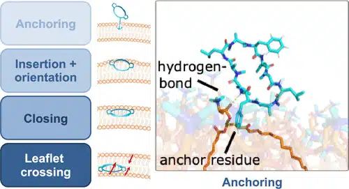 ראשית, המולקולה מעגנת את עצמה לפני השטח של הקרומית, לפני שהיא חודרת לקרומית בכיוון ניצב לה. בשלב הבא היא משנה את המבנה התלת-ממדי שלה בעודה עוברת דרך הקרומית, מסתובבת פעם