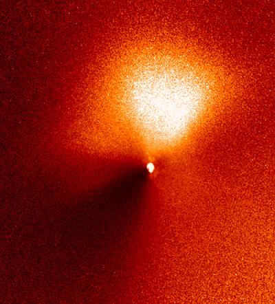 שני סילוני אבק המתפרצים מהשביט Tempel 1 כפי שצולמו מטלסקופ החלל האבל. קרדיט: NASA, ESA.