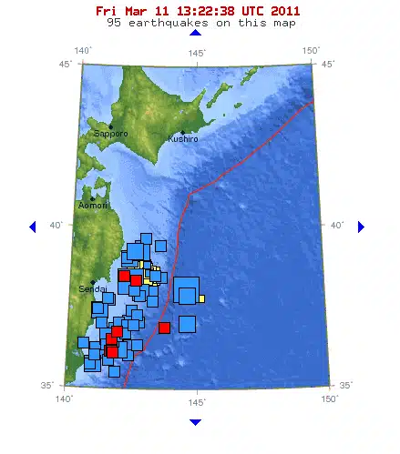 כזכור הכל התחיל אתמול – 11 במארס 2011, שעה 15:45 שעון מקומי (07:45 שעון ישראל), כאשר רעידת אדמה חזקה בעוצמה 8.9 בסולם ריכטר פגעה בחוף של צפון יפן. זו ככל הנראה רעידת האדמה החזקה ביותר שפגעה ביפן מאז החלו המדידות. הרעידה גררה אחריה גלי צונאמי לא רק ביפן אלא בכל אגן האוקיאנוס השקט, אם כי הגלים נחלשו כאשר הגיעו להוואי ועוד יותר כאשר הגיעו לחוף המערבי של ארה"ב היבשתית. עם זאת בשעה זו קיים חשש כי עיקר הנחשול עשה דרכו ישירות דרומה ובמהלך הלילה (שלנו) הם עלולים להכות באי הפסחה ובחופי צ'ילה.
