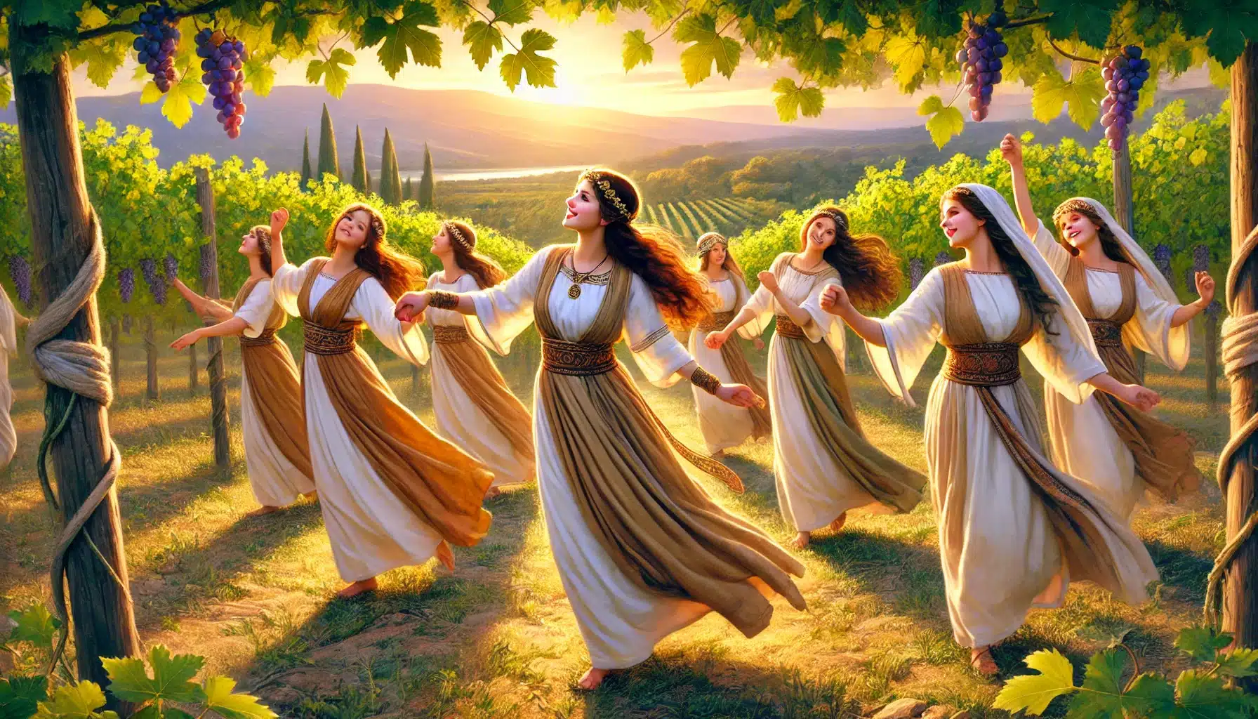 בנות שילה מחוללות בכרמים. האיור הוכן באמצעות DALEE ואינו מהווה תמונה מדעית