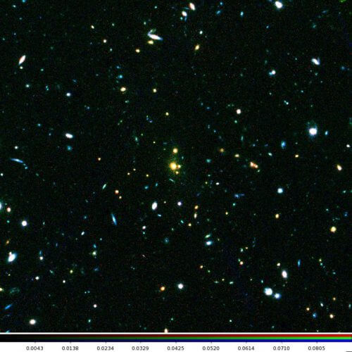 מתוך הבנה זו המשכנו להשיג תמונה של האשכול באמצעות הטלסקופ הגדול מאוד של מצפה הכוכבים האירופי . תמונה זו, שצולמה במצלמת אינפרא אדום, חשפה את נוכחותם המסומנת של עצמים אדומים קלושים – גלקסיות רחוקות; אבל בדיוק עד כמה רחוקות נותרה תעלומה.