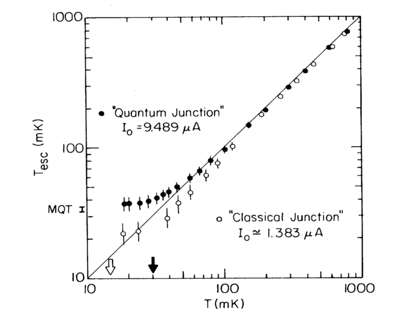 בשנות השמונים פרסמו שלושת זוכי הנובל מאמר פורץ דרך בכתב העת Physical Review Letters בו הדגימו לראשונה מנהור מאקרוסקופי בצומת ג׳וספסון, ראו גרף: