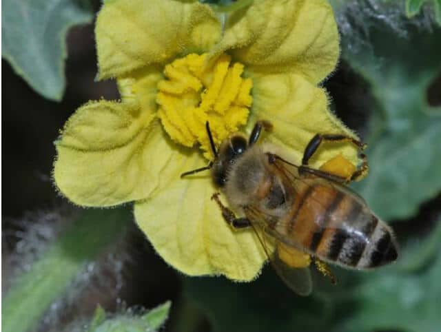 דבורי הדבש מעניקות לנו רשת ביטחון, אך המחקר מגלה כי איננו תלויים בהן. דבורת דבש על פרח אבטיח. צילום: גדעון פיזנטי, הפקולטה לחקלאות, האונ' העברית