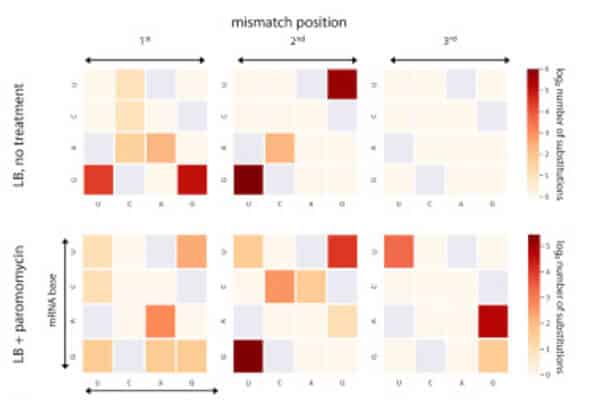 מינון נמוך של אנטיביוטיקה (בתחתית הטבלה) הוביל ליותר טעויות בתרגום, במיוחד במיקומים מסוימים. מעבדתו של פרופ' יצחק פלפל, מכון ויצמן