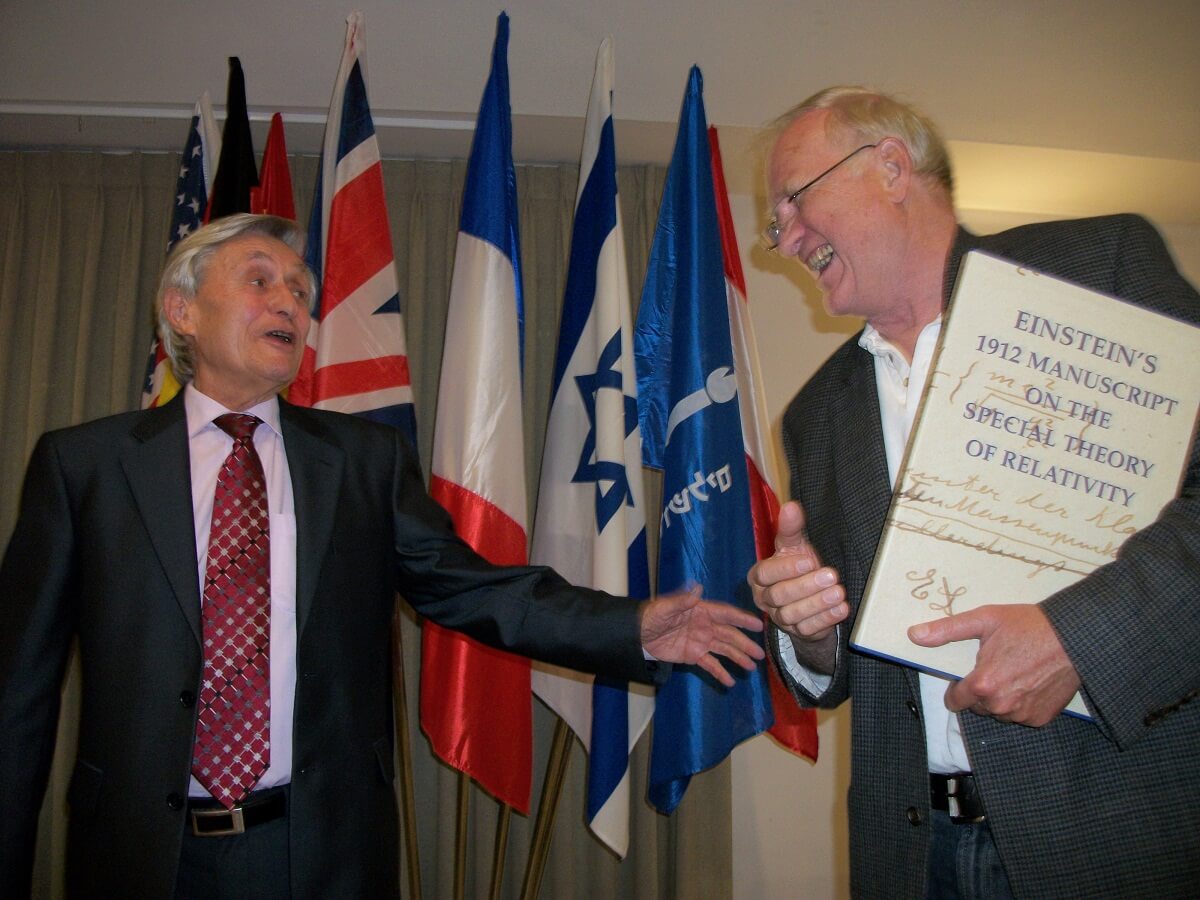 פרופ' קלאוזנר מקבל עותק ממאמרו של איינשטיין על תורת היחסות מפרופ' חנוך גוטפרוינד. צילום: ד"ר גלי ויינשטיין