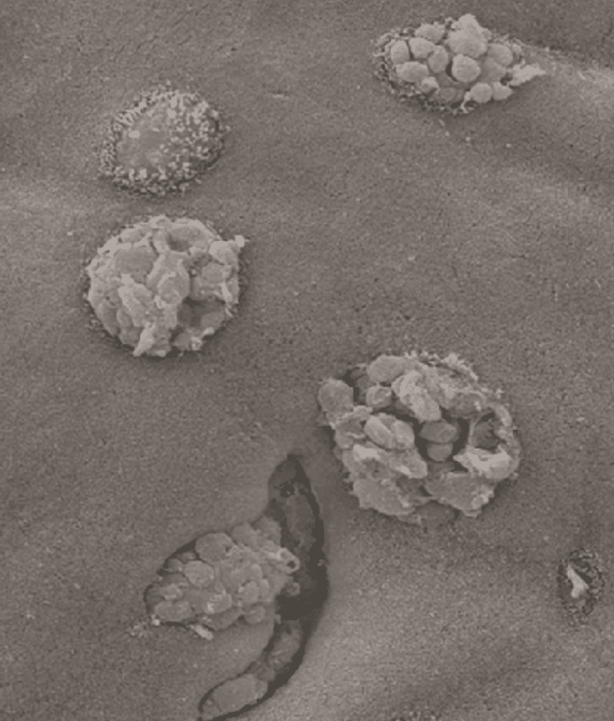 צילום במיקרוסקופ אלקטרונים חודר: שני תאי גביע המפרישים את תוכנם לתוך חלל המעי