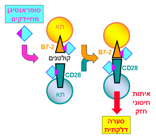צוות המחקר כבר הראה במחקרים קודמים שהסופר-אנטיגן חייב להתקשר לקולטן CD28 כדי לגרום נזק, אך המנגנון מאחורי דרישה זו נשאר לא ידוע. עכשיו, מראים החוקרים שכדי לזרז את ההתקשרות בין הקולטנים CD28 ו- B7-2, מולקולות הסופר-אנטיגן חייבות להתקשר ישירות לשני הקולטנים הללו. על ידי קשירה ישירה לא רק ל- CD28אך גם ל- B7-2, סופר-אנטיגנים מגבירים באופן ניכר את ההצמדה בין קולטנים אלו, מגבירים את יצירת הציר הקו-סטימולטורי וכך משרים שפעול יתר של תאי T ובכך מעוררים סערה חיסונית פתולוגית.